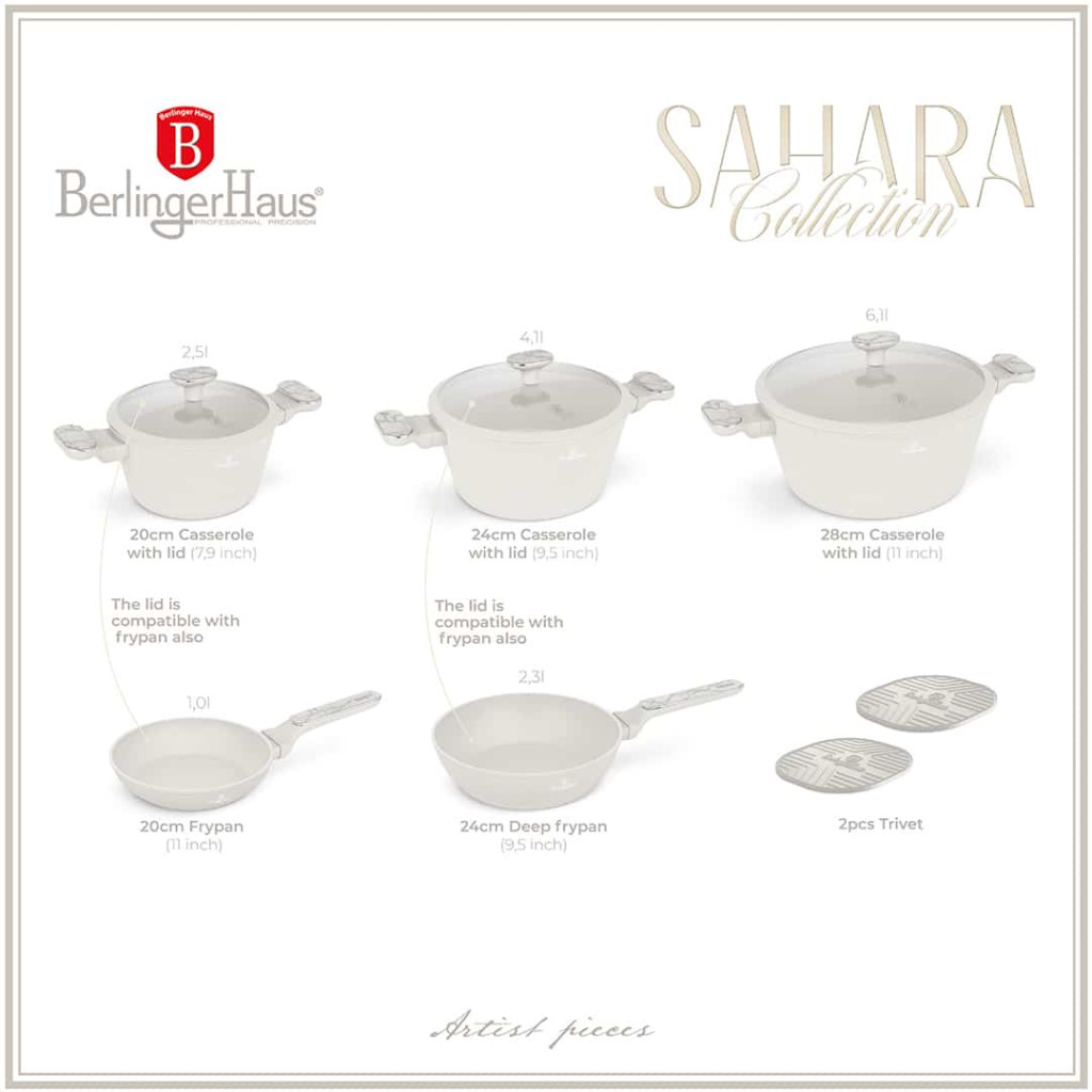 Berlinger Haus BH8400, Berlinger Haus Sahara kollekció, komplett edénykészlet, környezetbarát edények, kovácsolt alumínium edények és serpenyők, márvány dizájnú edények, prémium tapadásmentes edények, Sahara Marble 10 darabos edénykészlet, titanPro főzőedények, turbó indukciós edények